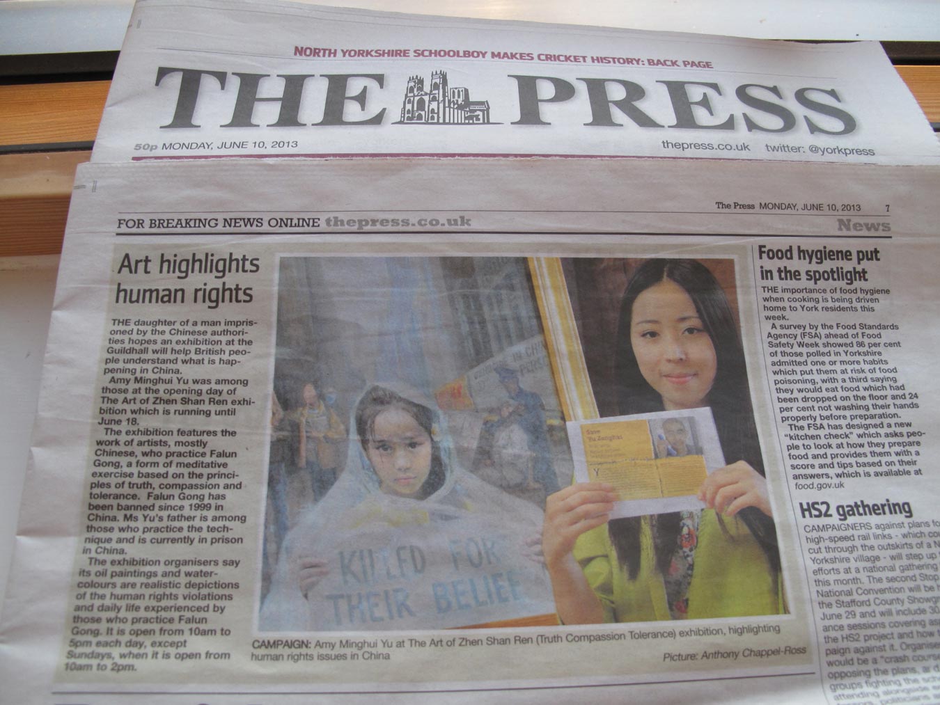 图4:英国约克地方主要报纸«新闻»(The Press)在二零一 三年六月十日发表题为“(真善忍)美展彰显人权”的题图文章