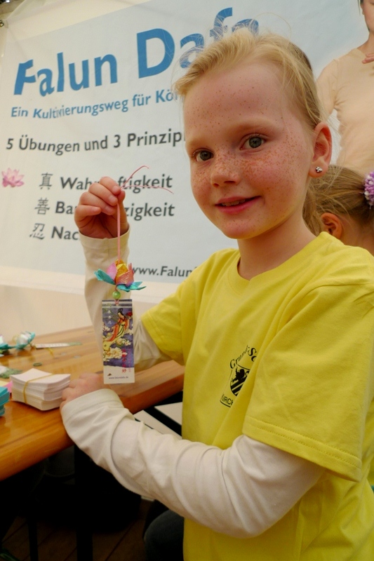 【明慧网二零一三年六月二十日】维赫市儿童节活动是由德国社会协会主办的,旨在促进和睦、建立适合家庭的社区。二零一三年六月二日,在明媚的阳光里,德国下萨克森州的孩子们成为“维赫市儿童节”的主角,儿童节上有为数众多的参展者,为孩子们表演了丰富多彩的节目。法轮大法学员也参加了这个活动,许多孩子和他们的妈妈们在向法轮功学员学习纸折莲花的过程中,同时也了解了法轮大法的美好。