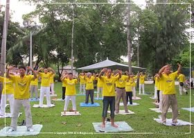 二零一三年六月二十一日,泰国Dude TV“健康和体育”节目摄制组来到曼谷法轮功学员的炼功点,拍摄炼功情景,并详细了解法轮功真相,关注中共对中国法轮功学员的迫害。