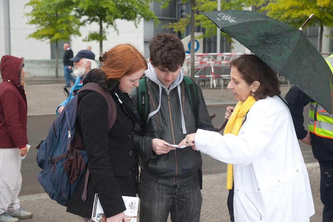 德国总理府前,路人听法轮功学员讲述发生在中国的迫害详情