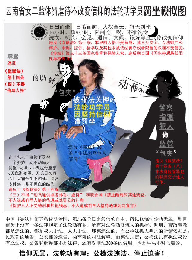 每天警察派两个刑事犯看着我,不允许和其他法轮功学员接触。有时偷着看看经书,被刑事犯张华发现就又抢又夺,交给警察挣分减刑。因为我看书,恶警常宝佳指使犯人掀掉我的被子,扒光我的衣服搜书,我就用生命来护法。此后我被关小号四十多天,在小号里,小便在屋里,大便也禁止上厕所,我据理力争,坚决不配合,警察才勉强同意上厕所。每天早上六点起床到晚上十点,警察指使犯人强迫我一个姿势坐着,实在坚持不住动一动她们就又打又骂。白天由监区内值班的刑事犯轮流看管,晚上由出工的刑事犯轮流看管。这些刑事犯白天干活很辛苦,晚上又得不到休息,她们把怨气都撒到我的身上,警察就用这种挑拨离间的方法让人仇视法轮功学员。