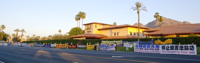 六月七日,天气炎热,最高温度华氏一百多度,抗议中共迫害的法轮功学员冒着酷暑,在习近平入住的凯悦酒店、会谈的安纳伯格庄园等地附近打出横幅,传达心声。