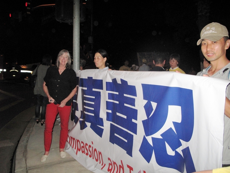 ![]() 棕榈泉长老会牧师克里斯蒂•迪克森(左一)前来支持法轮功学员 |