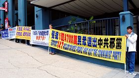 一对夫妻带着一个小孩来到中国城,他们一直看着法轮功的真相展板,学员问:“你们听过三退保平安的事吗?”他们开心地笑,太太点点头。学员说:“我们碰上也是缘分到了,我给你们起个化名,退出中共的组织。”他们很高兴,马上笑着点头。学员接着跟小女孩说:“小姑娘,你以后别戴红领巾了,也给你起名叫天乐,天天快乐。”一家三口和学员道谢,愉快地离去。