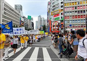 二零一三年七月十五日,法轮功学员在日本东京的繁华商业区新宿举行了游行集会,谴责中共十四年来对法轮功的残酷迫害,呼吁各界共同制止中共的暴行。