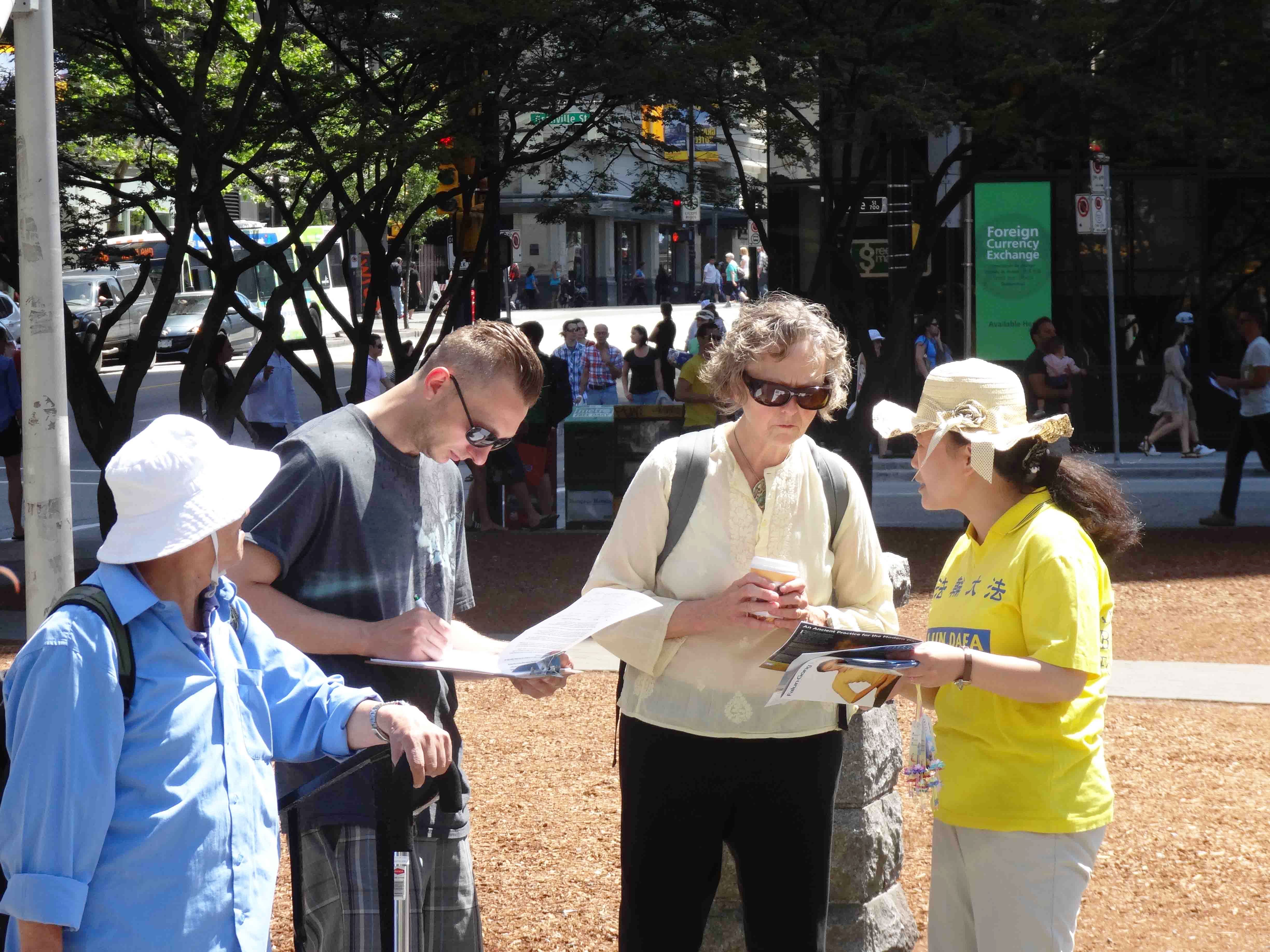 这一天,温哥华天气晴朗,法轮功学员们的集会和天国乐团的演出吸引了很多在市中心经过的行人,纷纷停下来观看集会,了解法轮大法真相,并签名支持停止迫害。有华人留学生当场签名,支持停止迫害法轮功。加拿大价值守护联盟刘先生特意赶到现场发言,表示对法轮功学员坚持和平反迫害的敬意和感谢,并表示邪恶中共本性不可改变必将解体。他说:“三退是对中共的彻底否定,中共政权是人类历史上罕见的残暴而虚伪的政权。”