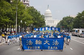 集会之后是声势浩大的游行。“真善忍”、“法轮大法好”、“停止迫害法轮功”、“法轮大法弘传世界”,法轮功学员高举着一排排横幅庄严肃穆地行进在美国国会与华盛顿纪念碑间这条美国首都的主干道上。