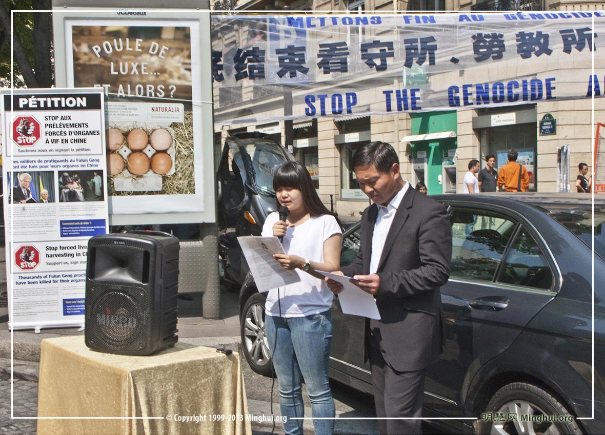 【明慧网二零一三年七月十九日】二零一三年七月十七日下午三点,法国法轮功学员在位于巴黎的中共使馆对面举行反迫害集会,抗议中共对法轮功长达十四年的残酷迫害,揭露中共活体摘取法轮功学员器官牟取暴利的反人类罪行。