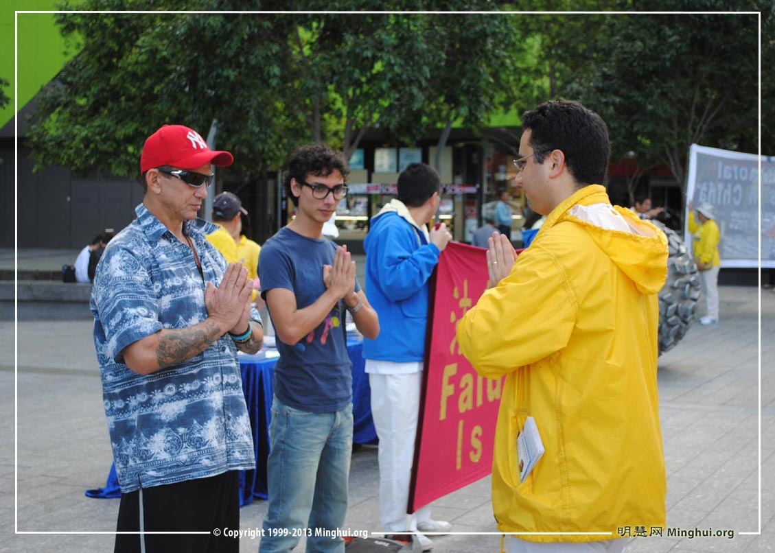 当法轮功学员在广场上展示功法时,陆陆续续有好几个民众前来想要学炼。刚从南美洲厄瓜多尔(Ecuador)来到澳洲,身心疲惫、承受诸多压力的穆瑞奇欧(Mauricio)在炼了几套法轮功功法后说:“太神奇了!我从未练过任何功,才炼了短短的几套功法,我就感到内心很祥和平静。感觉真是太美好了!我明天要到炼功点去炼功。”