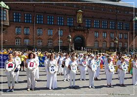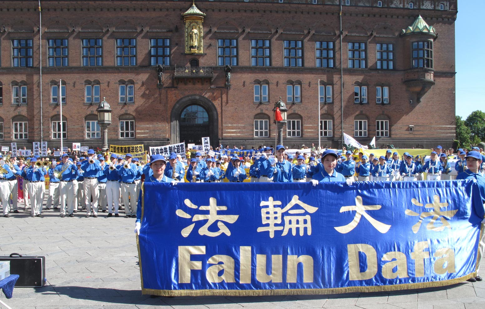 刚刚结束在哥本哈根市中心大规模环城游行的近千位法轮功学员直接在市政厅广场上摆出了声势浩大的阵势,站在整个队伍最前面的天国乐团气势如虹,轮流演奏“法轮大法好”、“法轮圣王”、“法正乾坤”、“法鼓法号震十方”、“送宝”、“欢乐颂”、“阿依达”等八首乐曲。法轮功学员举起的众多横幅一层一层地排列,汇成一道真相长城,横幅上的中文、英文、丹麦文都引人注目、直击人心,其中最重要的文字包括:“立即结束迫害法轮功”、“解体中共 结束迫害”、“天灭中共”、“退出党团队保命保平安”以及“法办江泽民、罗干、刘京、周永康”等 。