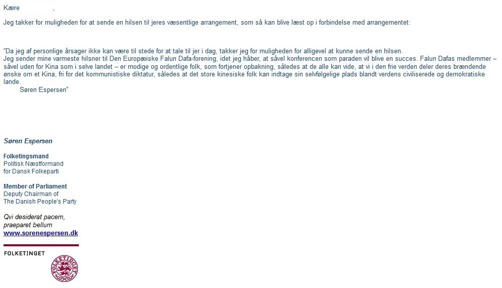 丹麦国会议员、丹麦人民党副主席索伦?艾斯普森议员给法轮功学员的支持信