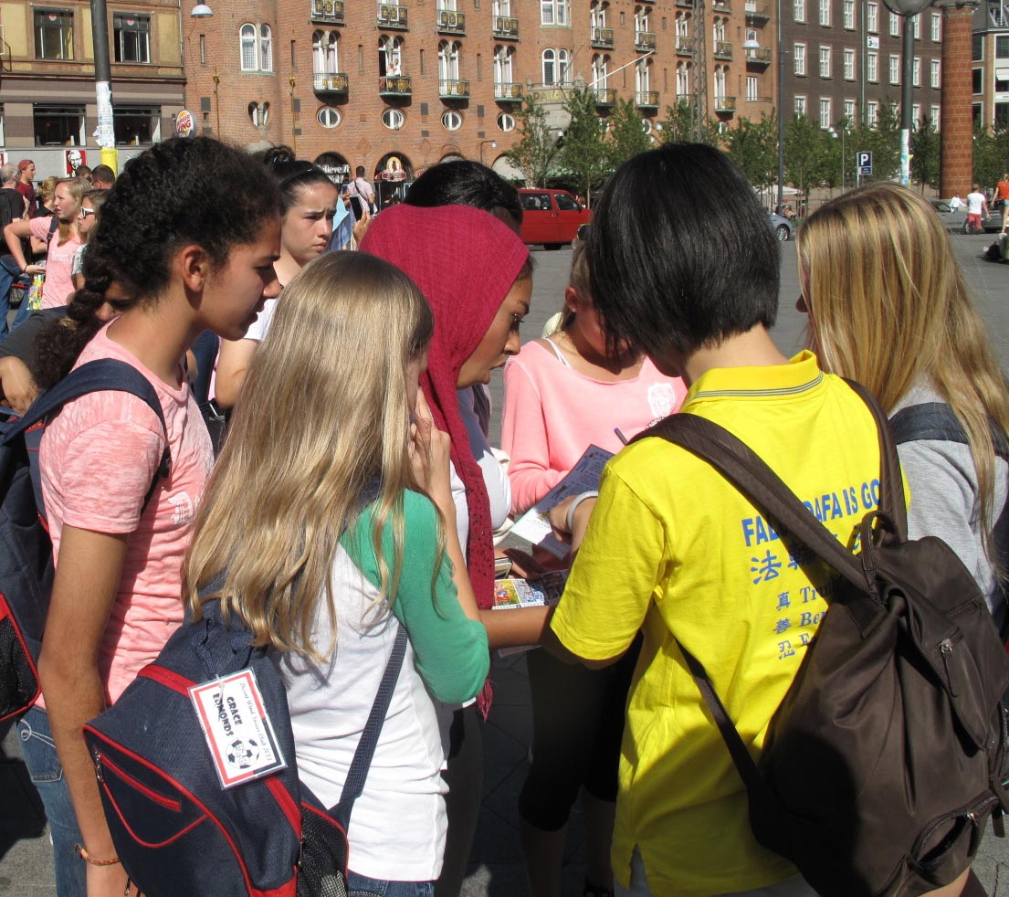欧洲天国乐团的演奏吸引众多的人群观看,包括从大陆来的游客。观众群里面站着从大陆浙江出来旅行的三位女学生,她们的眼睛睁得大大的,观看法轮功学员的演奏,以及这么多西方面孔的法轮功学员。一位法轮功学员走近与她们打招呼问好,得知她们刚刚出国旅游,请她们谈一下自己的感受,其中一位女学生立即睁大了眼睛,看着法轮功的队伍,做出满脸夸张表情地说了一声“天呀!”法轮功学员爱怜地看着这些年轻的学子,告诉她们:好好看看吧,这一切你们亲眼看到的都是真实的,看看这么多西方人修炼法轮功,因为法轮大法好。西方社会没有人可以要求别人信仰什么,一些西方人在中共迫害法轮功之前就开始修炼了,但是大部分西方人是由于不理解中共为什么迫害法轮功,从而开始了解,進而走入法轮功修炼的。三个学生认真地倾听着。这时西人法轮功学员Nicolas走过来,用中文向她们问好,那位喊“天呀!”的学生向这位西方法轮功学员提出了一个问题,“你为什么修炼法轮功?”就这样,一个普通的问题牵出了三位学生向西方法轮功学员了解法轮功真相的宝贵机缘。
