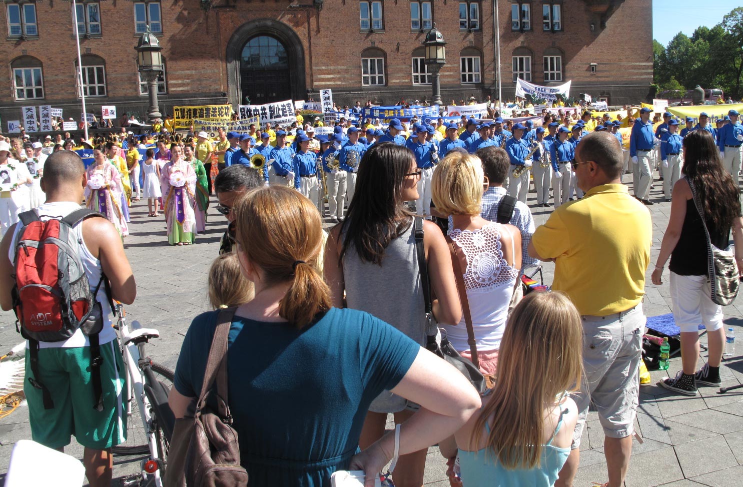 集会上,共有八位代表先后发言,整个过程中天国乐团五度演奏乐曲助阵。大规模的集会场面让经过市政厅广场的哥本哈根各界民众以及来自世界各地的游客受到强烈震撼,很多人停下脚步聆听天国乐团的演奏、发言以及法轮功学员的面对面讲真相。随着集会的進行,人们纷纷在反活摘器官征签表上签名,谴责中共迫害,选择和法轮功学员站在一起维护信仰自由和道德良知。