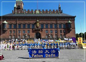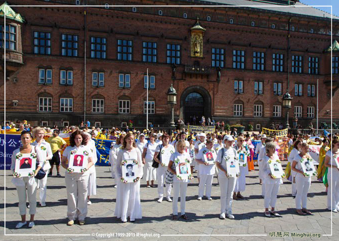 【明慧网二零一三年七月二十一日】(明慧记者唐秀明、长荣丹麦采访报道)二零一三年七月二十日,丹麦首都哥本哈根经历了非常炎热的一个夏日。日历翻到这一天,中共邪党对法轮功的迫害整整持续了十四年。当日下午,近千名欧洲法轮功学员汇集到哥本哈根市政厅广场举行大型集会,揭露中共对法轮功的残酷迫害,重点曝光中共活摘器官的反人类罪行;要求立即停止迫害,并把对法轮功进行群体灭绝的罪犯绳之以法。