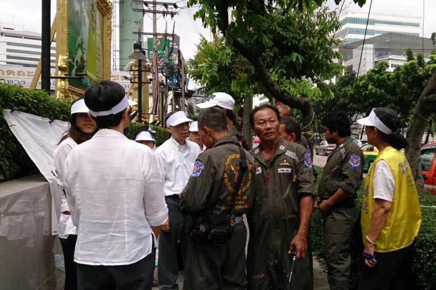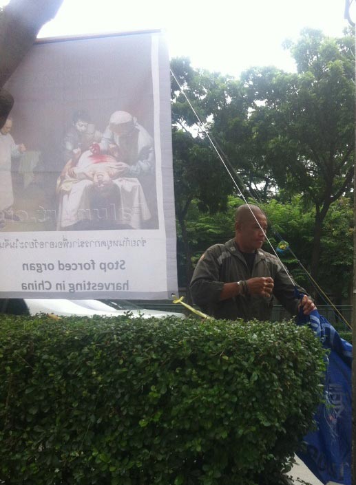 上午九点左右,部份泰国法轮功学员来到中使馆对面,打出了“立即停止迫害法轮功”、“帮助制止中共活摘器官”等泰英中语的横幅,开始和平静坐。不久,突然冲过来六七个身穿某“慈善堂”制服的人,剪、拽、抢法轮功学员的横幅。学员上前和他们讲法轮功被迫害真相,指责这种恶行,这些人说是中共使馆叫他们来的。由于对方不听劝阻,法轮功学员报警,大批警察赶来了解情况后,对这伙人说,法轮功学员有权利在此进行活动,他们很平和,是合法行为。警察还对法轮功学员说,以后你们再来这里告诉我们,我们派人保护你们。这帮恶徒不得不灰溜溜地走了,中使馆的邪恶操纵及干扰彻底失败。