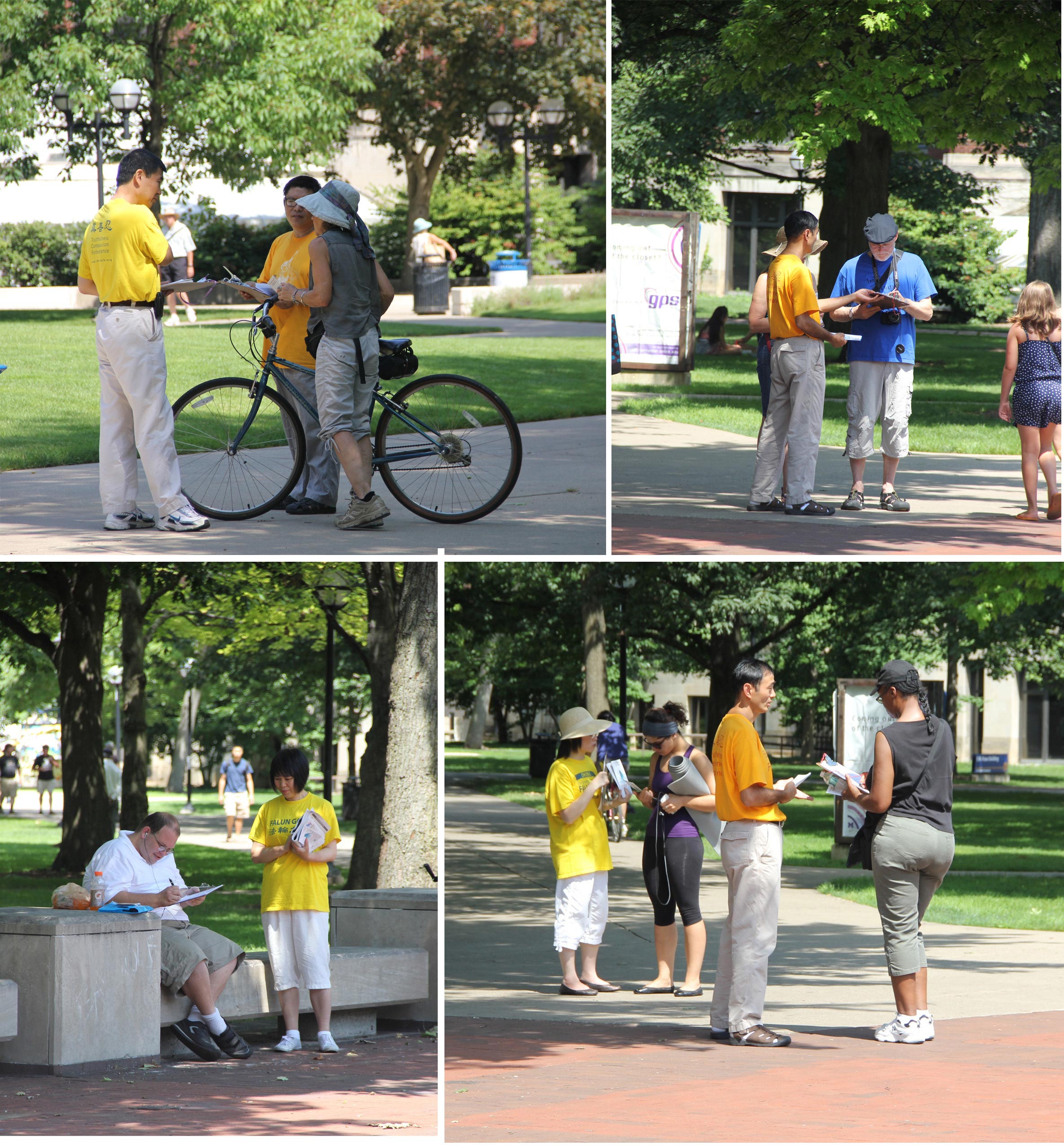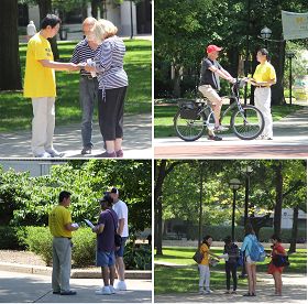 充满正义感的两名西人学生在征签板上签名。泰勒(Taylor)说:“我认为这场迫害已达到残忍的最顶峰,这是杀人啊,将人们从关心他们的家人和朋友身边带走并杀害。这是我听过世上最不公平的事情,太可怕了。我要尽我所能的帮助停止这场迫害。”