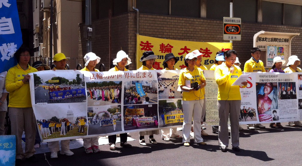 ![]() 法轮功学员在大阪中领馆前宣读公开信,抗议中共十四年的迫害。 |