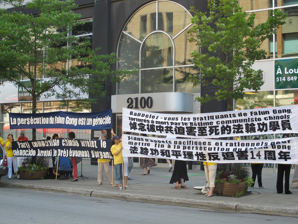 ![]() 图1:法轮功学员聚集在蒙城圣•凯瑟琳大街的中领馆前拉开横幅、展板,向公众展示中共十四年来在中国大陆迫害法轮功和活体摘取法轮功学员器官的真相。 |