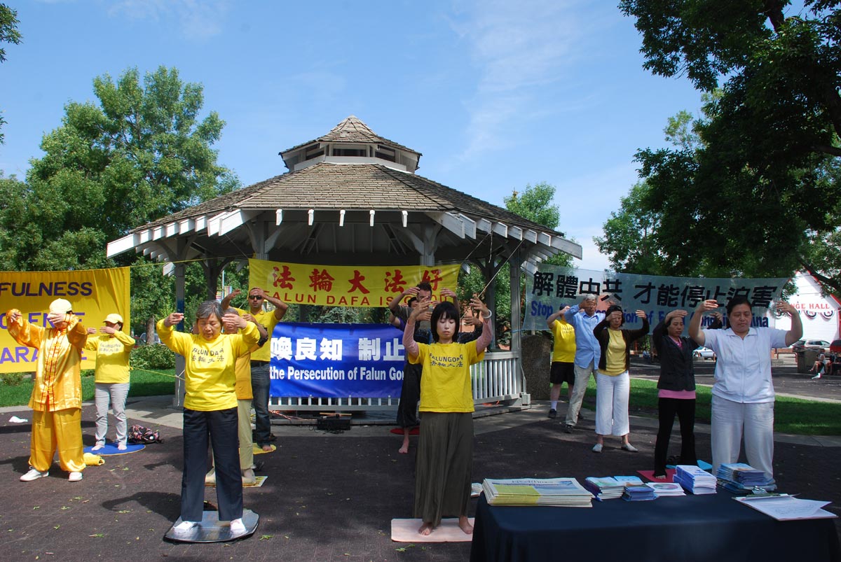 '图1、埃德蒙顿法轮功学员集体炼功'