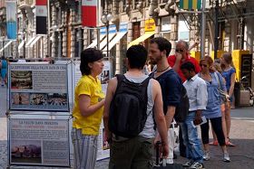 一位背着旅行包的中国人说:支持法轮功反迫害。他说,从小就知道共产党坏。他爱国,但又以中共统治下的当今大陆为耻,这让他感到痛苦与困惑。学员告诉他,这都是因为中共在祸害中华民族,中国与中共从来就不是一个概念,是中共在混淆是非,欺骗人们。任何真正热爱中国的人,都一定会唾弃中共。这位年轻人表示,他相信中共马上就会倒台!真为那些现在还不肯退党的中国人而着急!