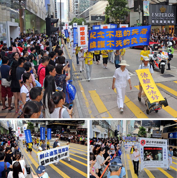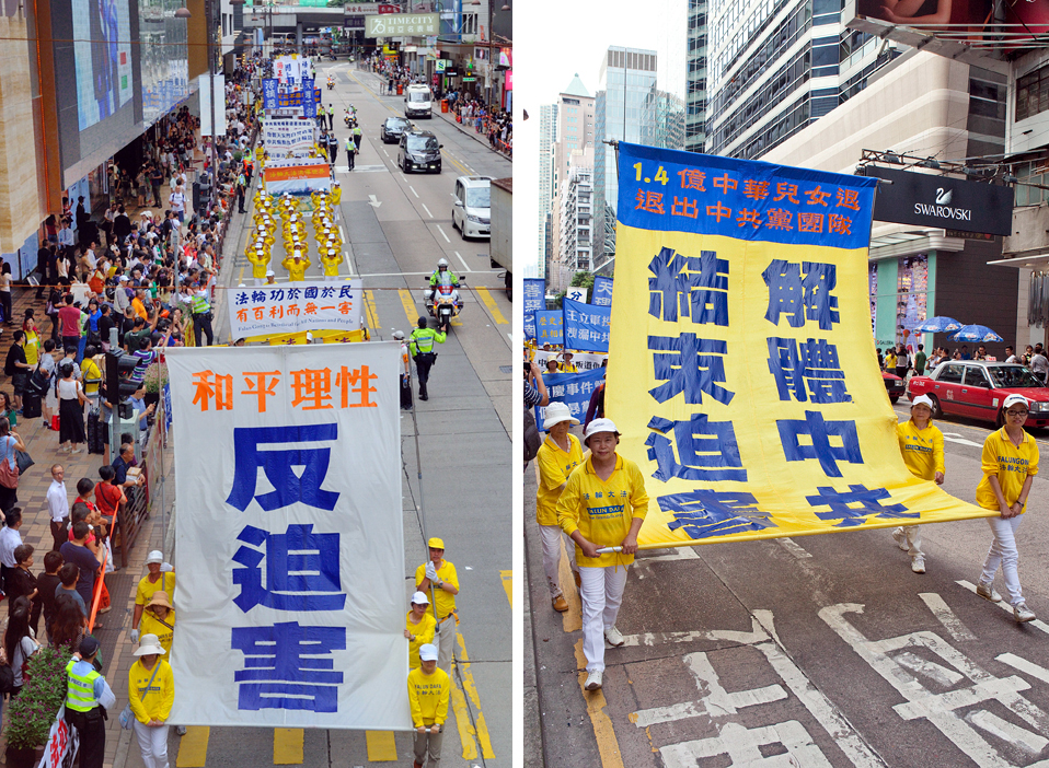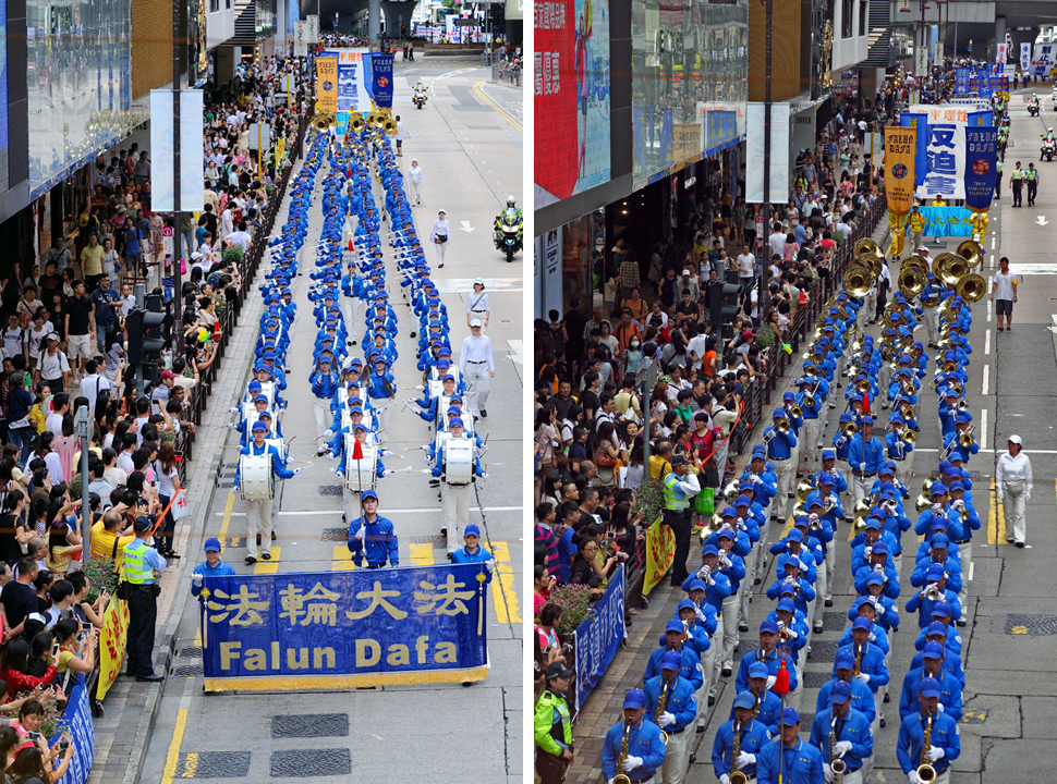 反迫害集会于下午二时结束后,紧接着数百名法轮功学员的游行队伍由长沙湾游乐场出发。由二百五十位法轮功学员组成的天国乐团前导,一路吹奏 《法轮大法好》、《法鼓法号震十方》、《法正乾坤》、《送宝》、《佛恩圣乐》、《法轮圣王》等多首正气浩然的军乐,带领游行队伍,穿越港岛主要街道,游行队伍经过沿途,吸引道路两侧的广大民众以及游客围观,不断有人拿起手机、ipad、相机等拍摄游行画面。