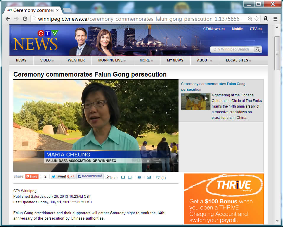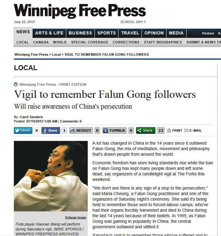 这次烛光悼念活动在温尼伯当地的Winnipeg Free Press报纸,CTV 电视台和加拿大广播电台CBC三大媒体都有报道,经过法轮功学员十四年在全世界坚持不懈的讲真相,揭露中共的迫害和欺世谎言,越来越多的人明白了真相,而且随着《九评共产党》发表后掀起的退党大潮,越来越多的中国人也不再愿与共产党为伍。从最近几次的反迫害征签活动可以感觉到,以前那种受共产党欺骗而敌视法轮功的人现在是明显减少了。共产党对法轮功的无理迫害已经越来越失去民心,最终必将在可耻中收场。