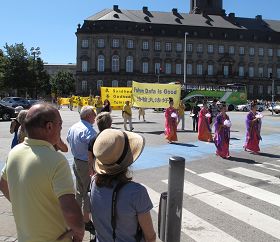 当天的游行队伍由天国乐团、法轮大法弘传世界、停止迫害及制止活摘器官和三退(退党、退团、退队)保平安四大部份组成的法轮功游行队伍浩浩荡荡地穿行在哥本哈根市中心的街道上,延绵几个街区的游行队伍犹如一个流动的法轮功真相长廊把真相带到人们面前。天国乐团震撼人心的演奏、伴随“法轮大法好”歌曲翩翩起舞的仙女、模拟演示中共活摘法轮功学员器官的展车、身穿金黄色传统服装腰鼓队击出的有力鼓点以及“法轮大法好”的呼声,丰富而生动的真相信息全方位地冲击着路人的心灵。
