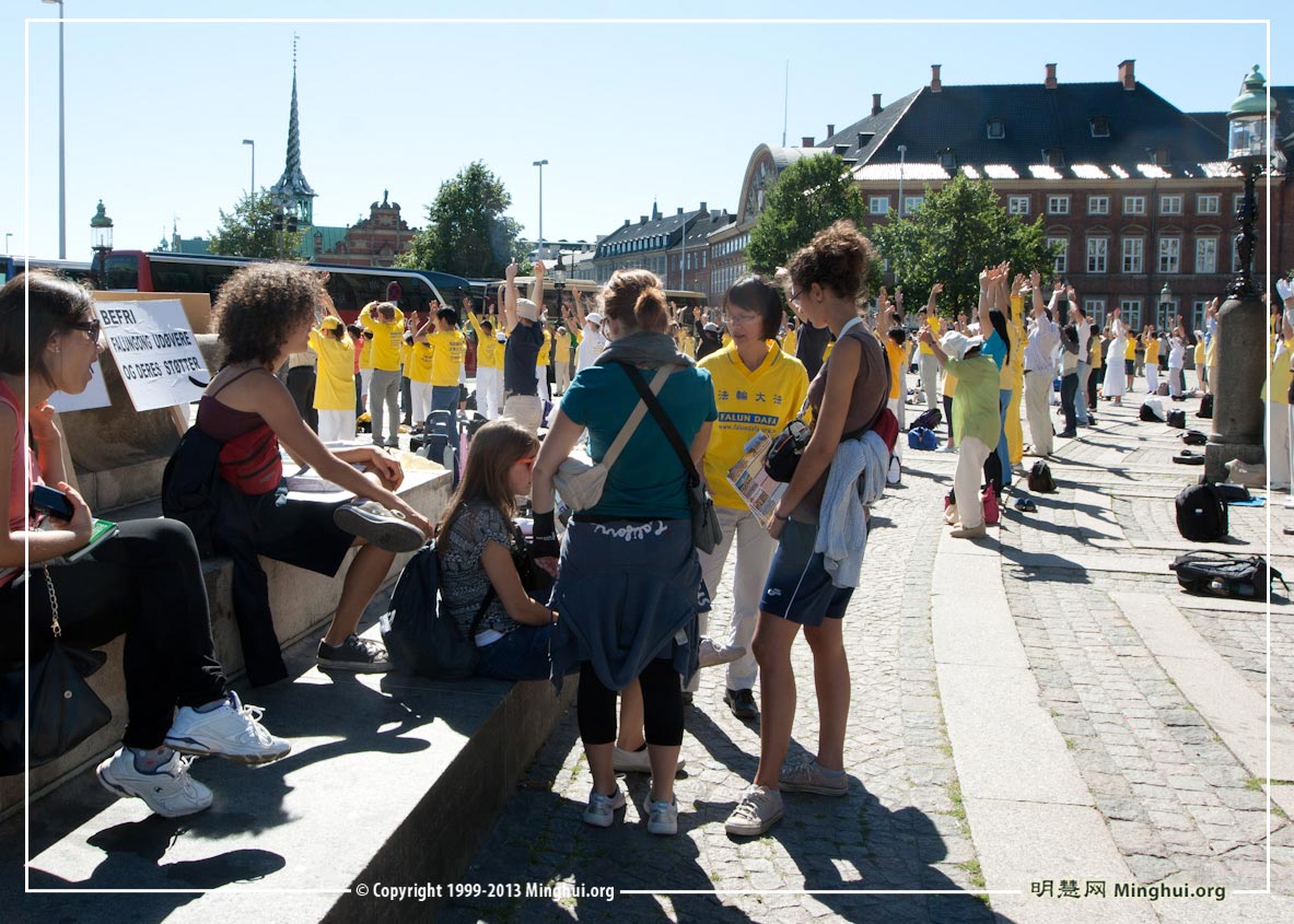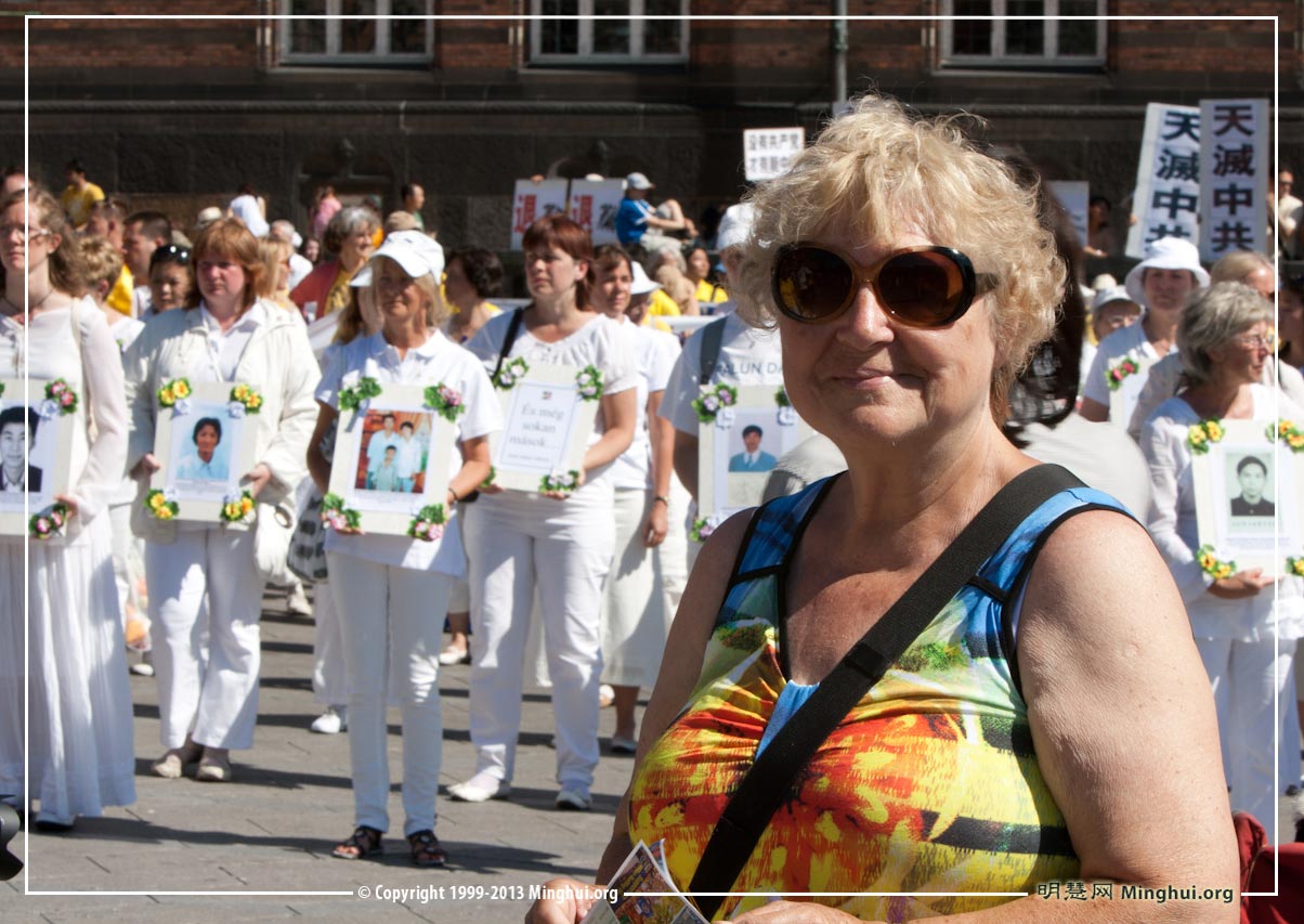 游行队伍所到之处,备受关注。看到法轮功的美好、游行队伍的平和以及中共迫害之残忍,很多丹麦人和游客感到震惊,有的表示自己头一回看到法轮功在中国受迫害的信息,有的说自己已经知道了,大多数人爽快地在制止中共活体摘取法轮功学员器官的呼吁信上签名。不少从大陆出来的旅游者看到这一幕,都忙着拍照和录像。