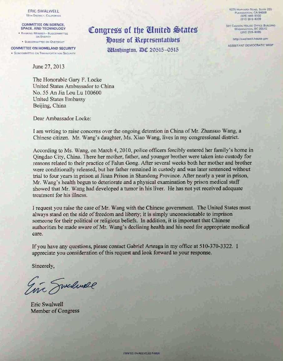 【明慧网二零一三年七月三日】二零一三年初新上任的美国国会众议员艾瑞克·史瓦维尔(Eric Swalwell)近日致信美国驻华大使骆家辉,要求骆家辉大使向中国政府提出因信仰法轮功而被非法关押的王占所的案例。