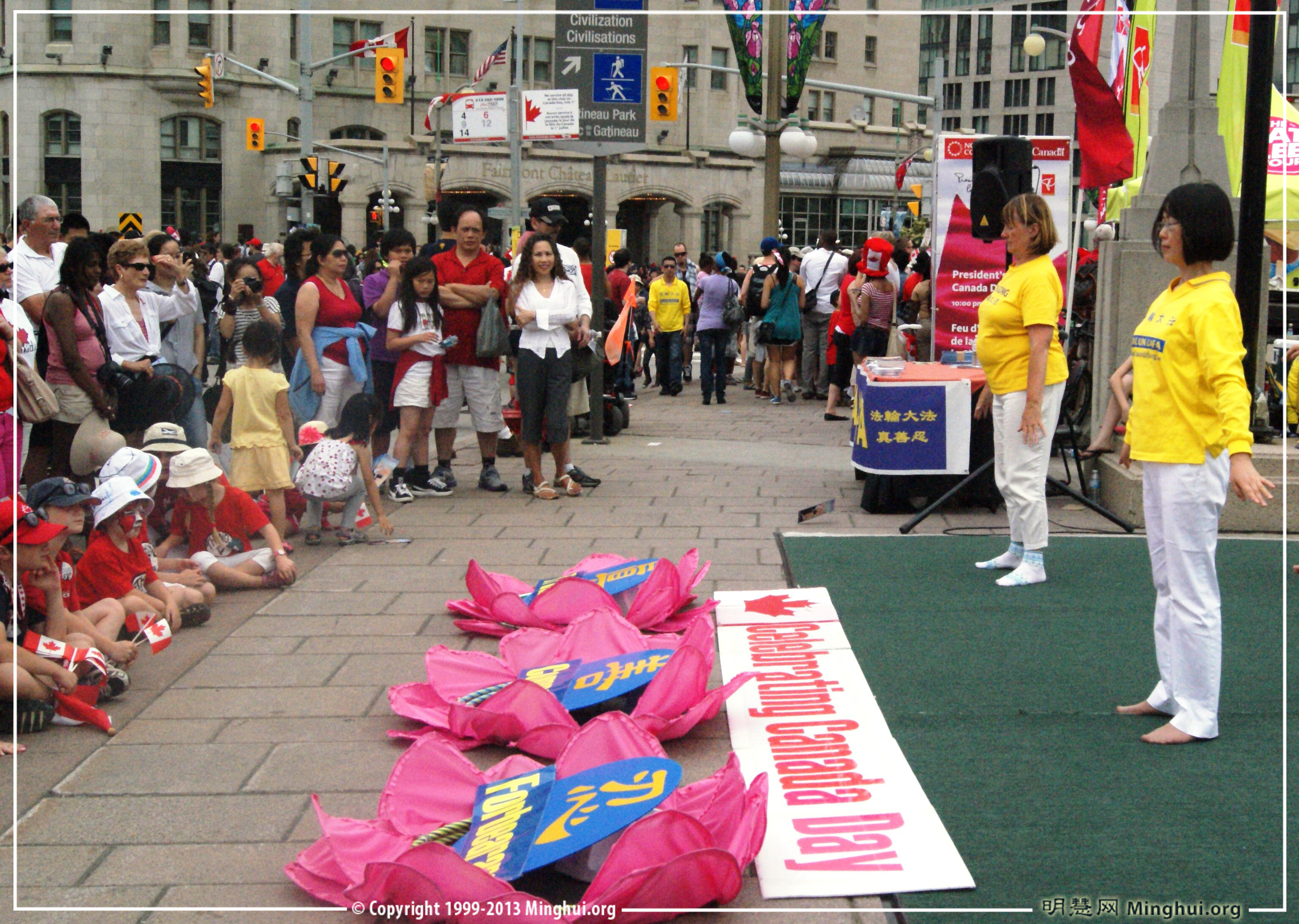 法轮功学员从二零零零年开始,每年国庆节都参与渥太华国会山前的庆祝活动,传播法轮大法“真、善、忍”的福音。二零零二年开始,他们为加拿大人带来了文艺演出,功法演示、舞蹈(中国古典舞、民族舞、民间舞)表演、舞狮和天国乐团的演出无不受到大量观众的热烈欢迎。