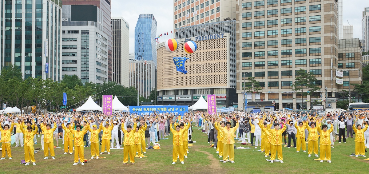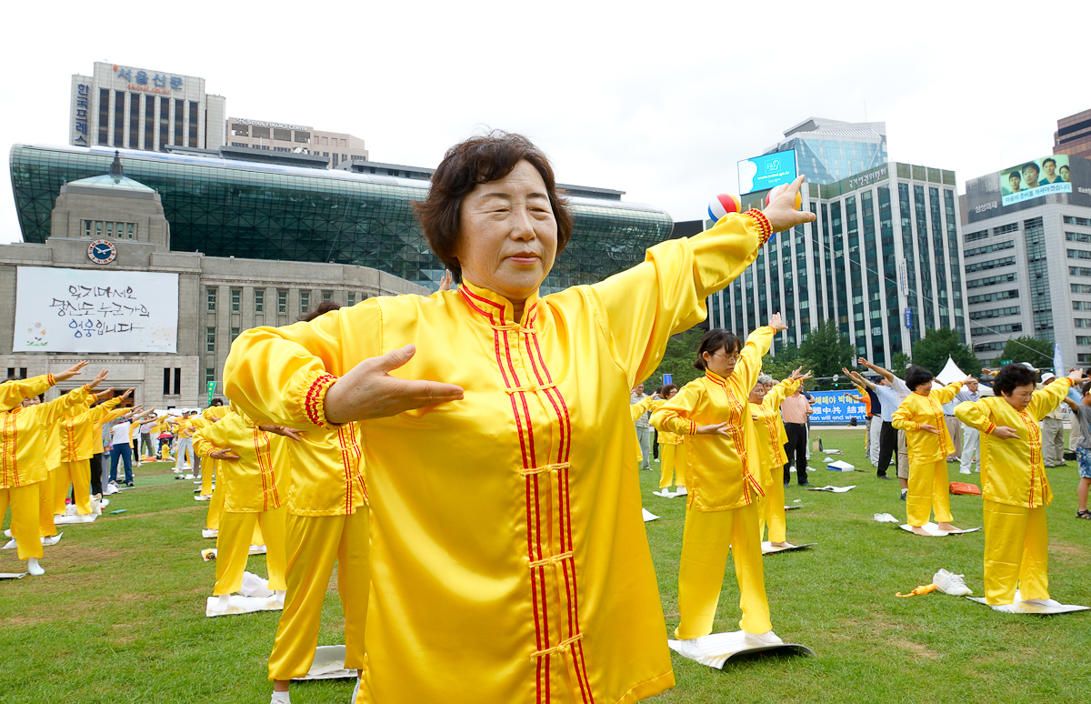 图1~5 : 首尔广场前草坪上,韩国法轮功学员集体炼功