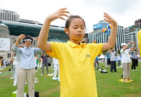 图1~5 : 首尔广场前草坪上,韩国法轮功学员集体炼功