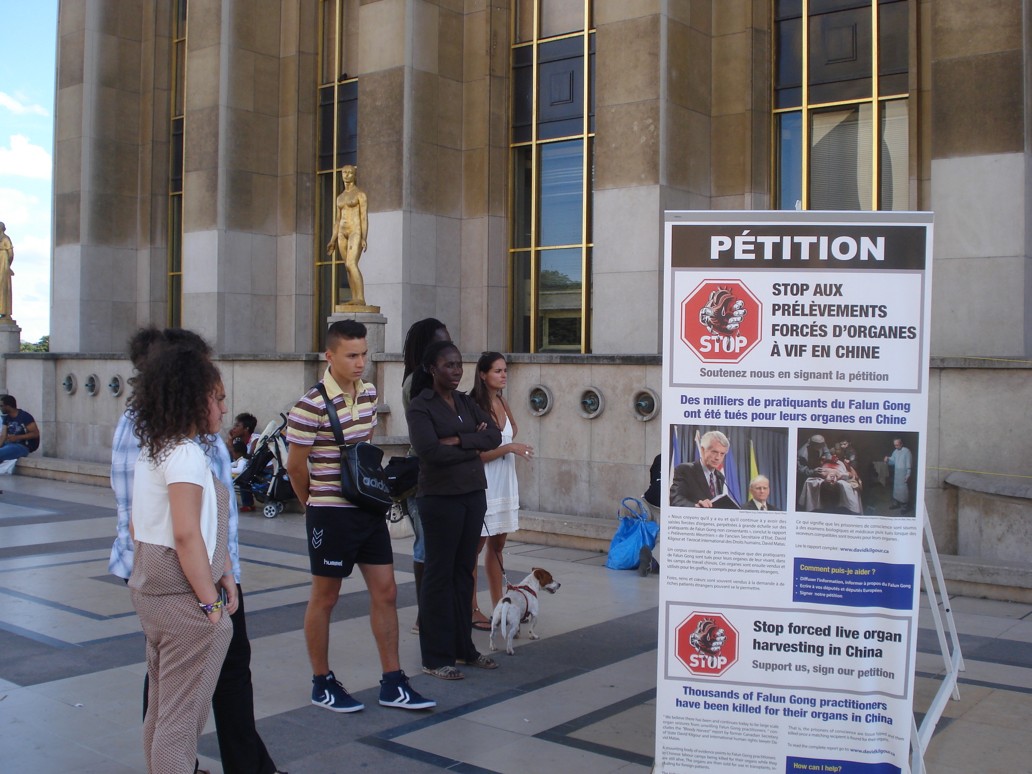 一位法国女士签完字后,表示要进一步上网了解法轮功,她鼓励法轮功学员鼓起勇气坚持下去。