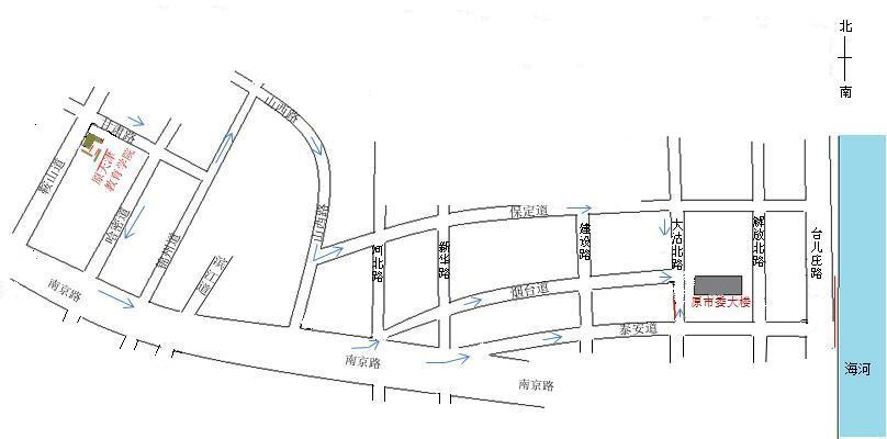 法轮功学员E:学员们自发的分成两路。一路从甘肃路右转经哈密道至南京路,再经烟台道或经泰安道至天津市政府。(见图2-6:从教育学院至政府大楼沿途主要路段)另一路从甘肃路左拐经山西路、保定道至市委市政府大楼。大家一路浩浩荡荡步行去了天津市政府,速度极快,也就是十来分钟就到了,学员们先到警察后到。让那些警察们都想不明白。