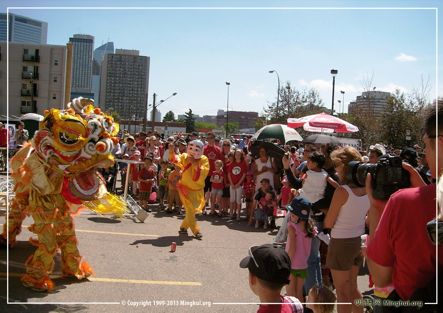 ![]() 图1:卡尔加里国庆日,游人观赏法轮功学员表演狮子舞 |