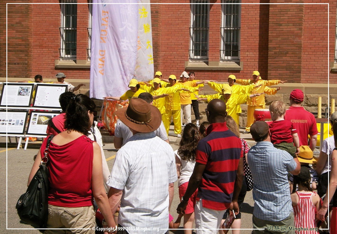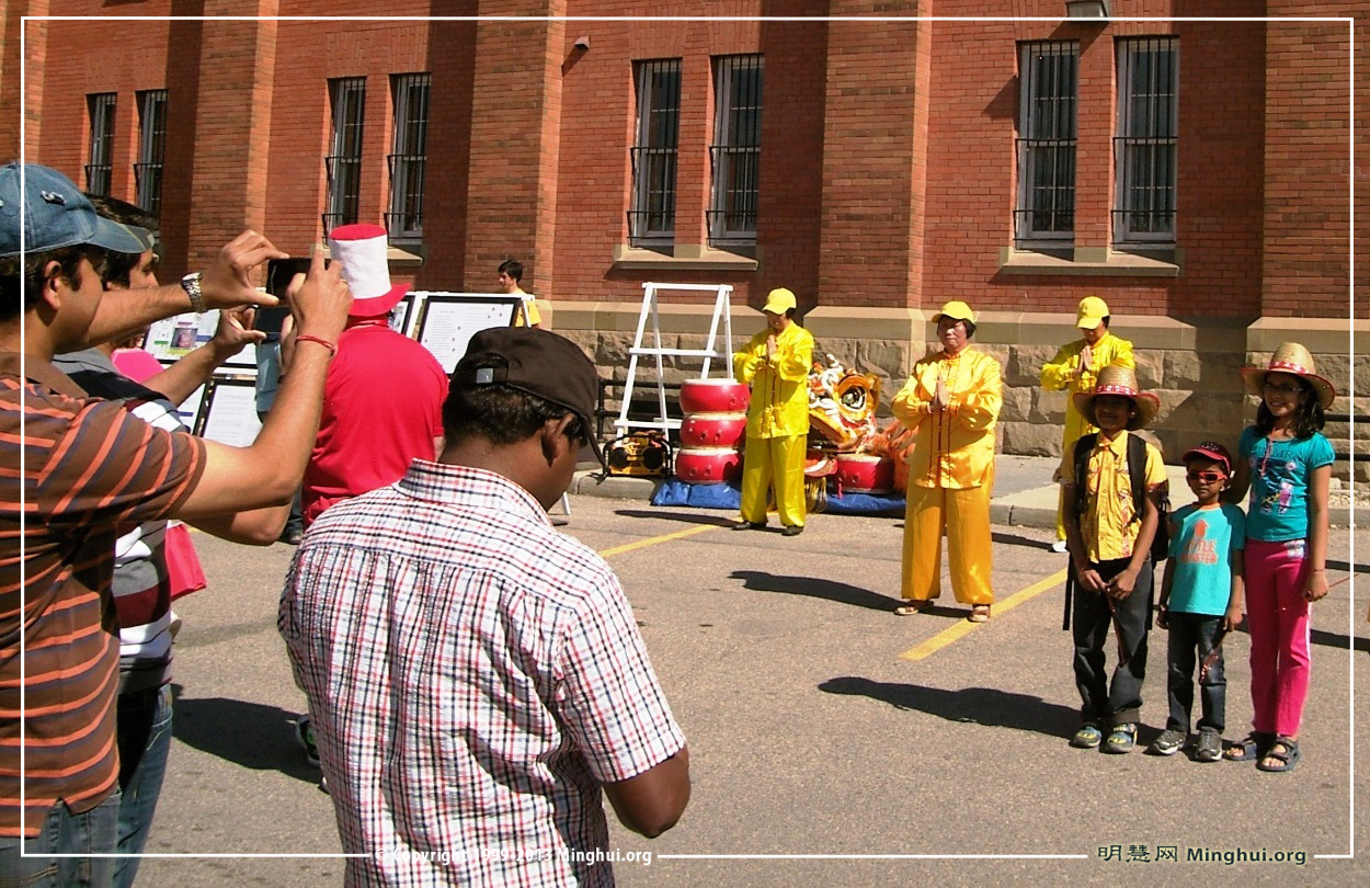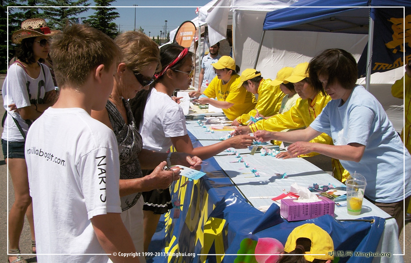![]() 图3:卡尔加里国庆日,介绍法轮功的真相展板吸引了众多游人 |