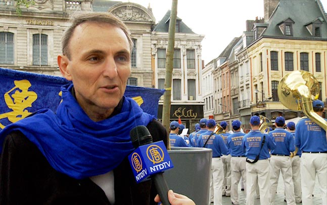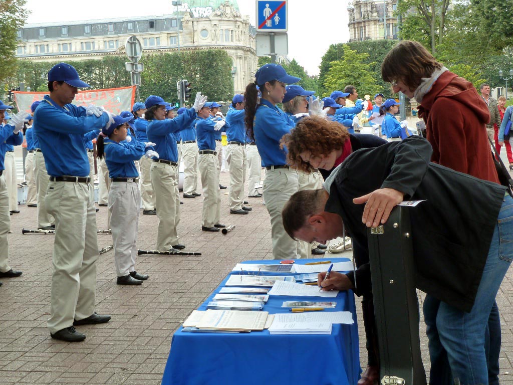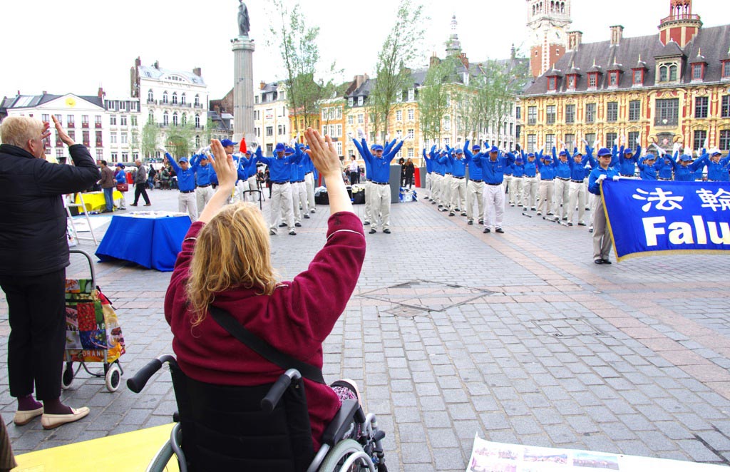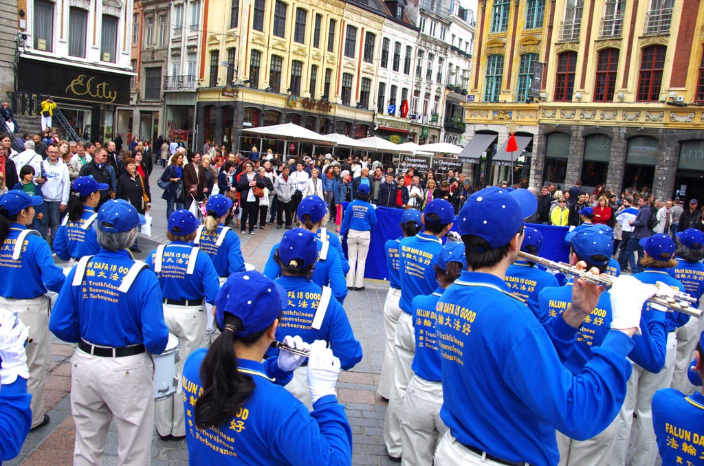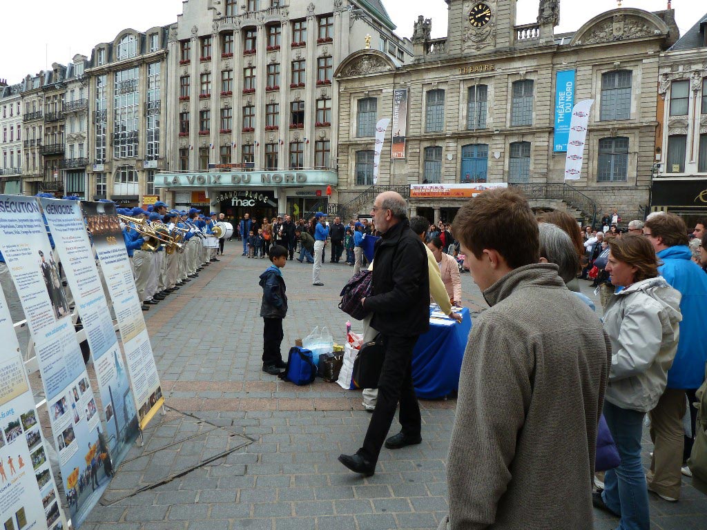【明慧网二零一三年七月五日】(明慧记者容法里尔报道)二零一三年六月二十九日,欧洲天国乐团在法国里尔市举办活动;介绍法轮大法(又称法轮功)并揭露中共的迫害暴行。等候签名反迫害的民众排起了队伍,希望学炼法轮功的有缘人记下了炼功点的联系方式,人们真诚地感谢天国乐团给他们带来美好的乐曲和真相。当天路过活动现场的Benoit事后给法轮功学员写来邮件,赞叹:“你们的团队非常了不起,非常的勇气可嘉,我不认识你们,但对于我而言,毫无疑问,你们具备了非常了不起的人类价值观。”