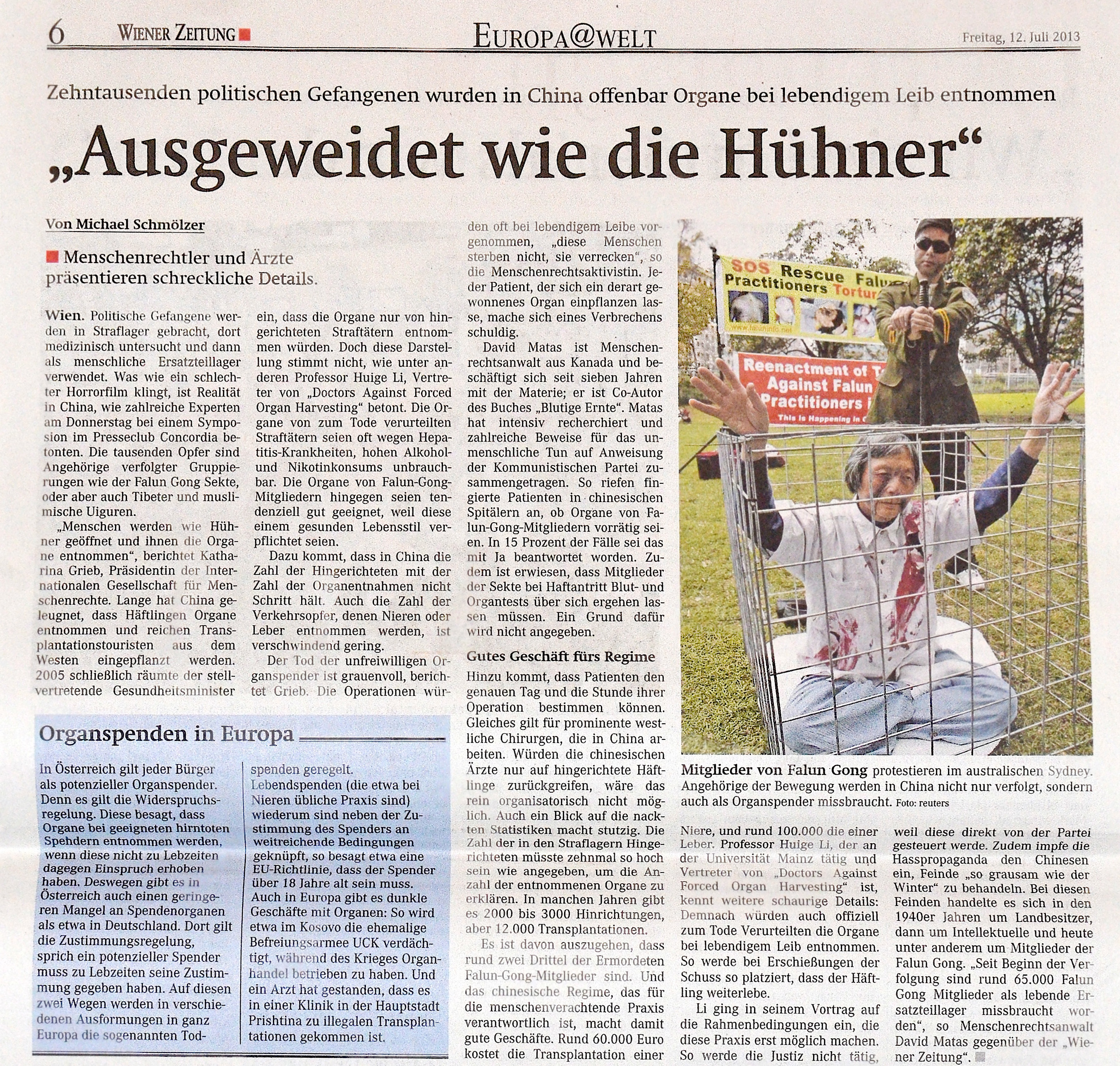 【明慧网二零一三年八月十日】二零一三年七月十二日,奥地利《维也纳日报》 ( WIENER ZEITUNG )以“活摘关押人员的器官交易迅速增长”为题,报道了中共活摘法轮功学员器官的暴行。