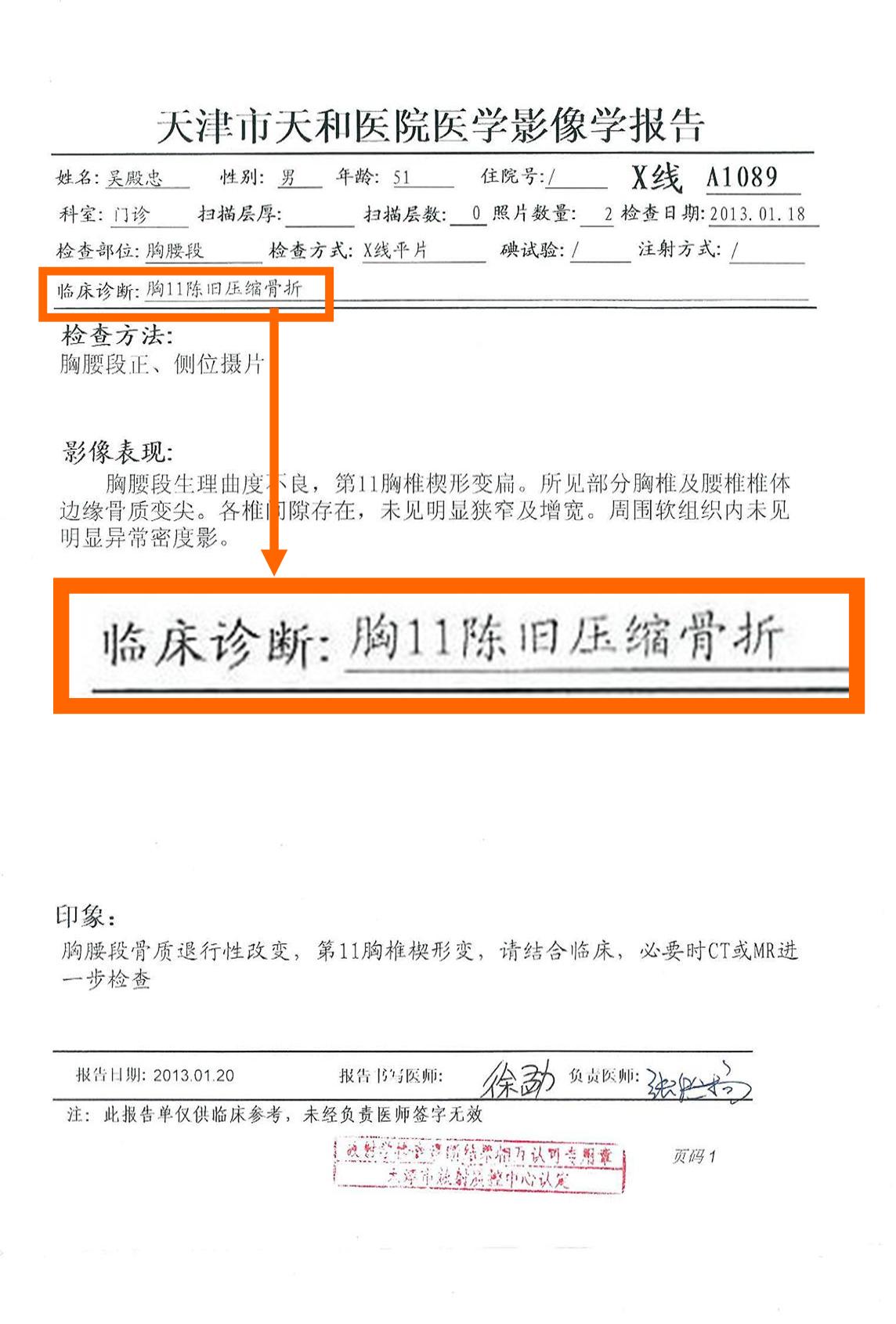 我在二零一三年一月十二日从天津滨海监狱(原港北监狱)回到家中。因为在监狱期间警察指使犯人对我故意伤害,我一直腰背非常疼痛。回家的第一件事就是到医院检查身体。经过医院检查证明:我的脊椎胸腰段曲度不良,第11胸椎楔形变扁,临床诊断:胸11椎陈旧压缩骨折(这是监狱包夹我的张锁强按我头所造成的后果);腰椎间盘突出和骨质增生、腰椎退行性变(这是监狱包夹我的张晓月用膝盖用力撞击我的腰部所造成的后果);医生说:“只有很强的外力撞压才能导致这样的骨折。”