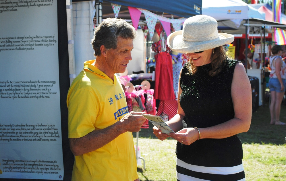 保罗(Paul)看见法轮功的展位后,连忙跑去告诉在另一个展位上的妻子凯莉(Kerry)。在和学员交谈许久后,凯莉非常开心的说:“这(法轮功)就是我要找的。”