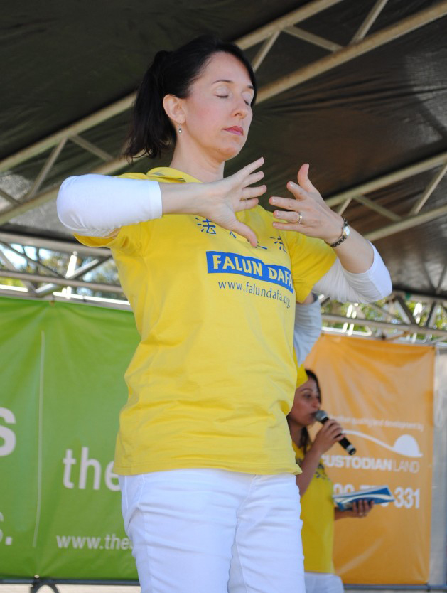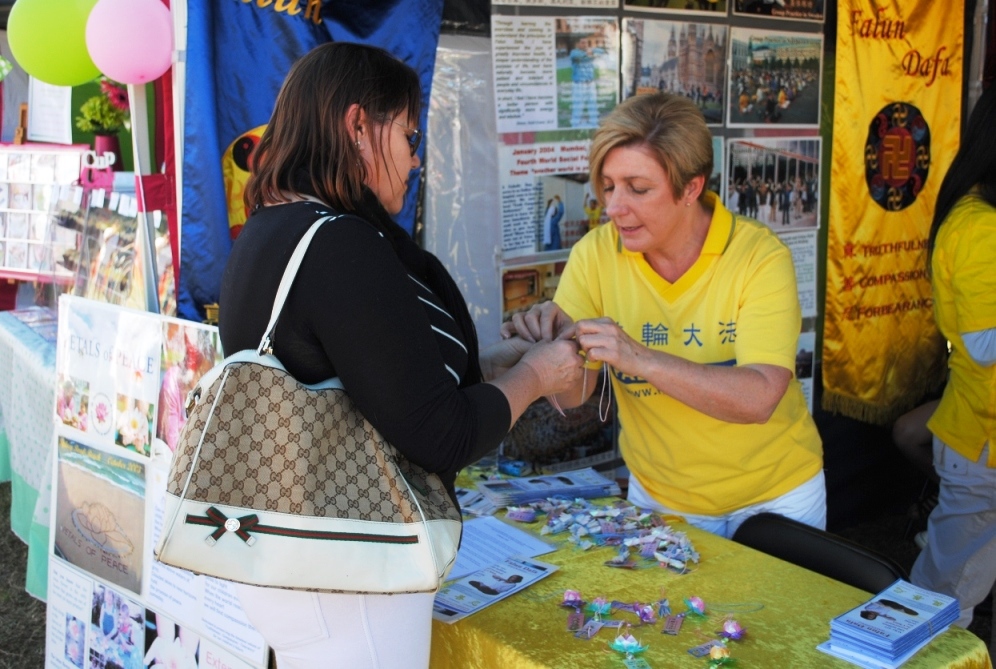 在法轮功展位对面的另一个展位由一名叫凯西(Cassie)的西方人负责。凯西和法轮功学员妮娜(Nina)是多年的老邻居,她常常听妮娜说起法轮功的美好。在亲眼看见功法展示后,凯西说:“这两天从法轮功展位散发出的正面能量真的太好了!我现在非常想学炼法轮功!”