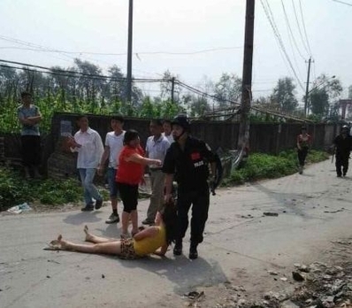 图片中的女村民瘫软地半躺在地上,鞋已被特警拖拉掉。特警拽着她的头发,就象拽着一个物体那样随意。妇女的尊严荡然无存,特警的暴戾充斥画面。