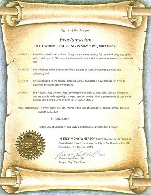 因此,我,弗农·杰西·台丝特鲁斯,印第安那州南港市市长,现在宣布二零一三年八月九日为南港市法轮大法日,并请所有市民都能给予关注。