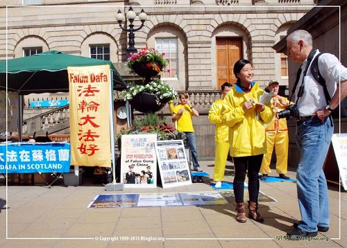 苏格兰法轮功学员目前正在各主要城市进行系列洪法和传真相活动。在过去的两个月里,巡回洪法到达了格拉斯哥及阿伯丁。在二零一三年八月十日,巡回洪法抵达爱丁堡的王子街,展开为期一天的洪法活动。