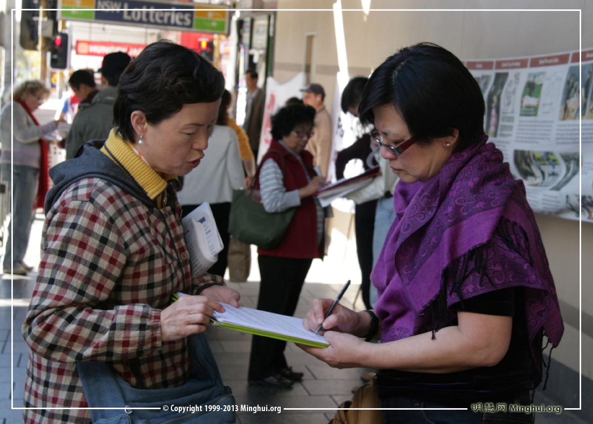 【明慧网二零一三年八月二十二日】(明慧记者蕴韵澳洲悉尼报道)二零一三年八月十八日,悉尼法轮功学员在Burwood社区举办征签活动,曝光中共活摘法轮功学员器官,强烈呼吁制止这惨绝人寰的罪行。