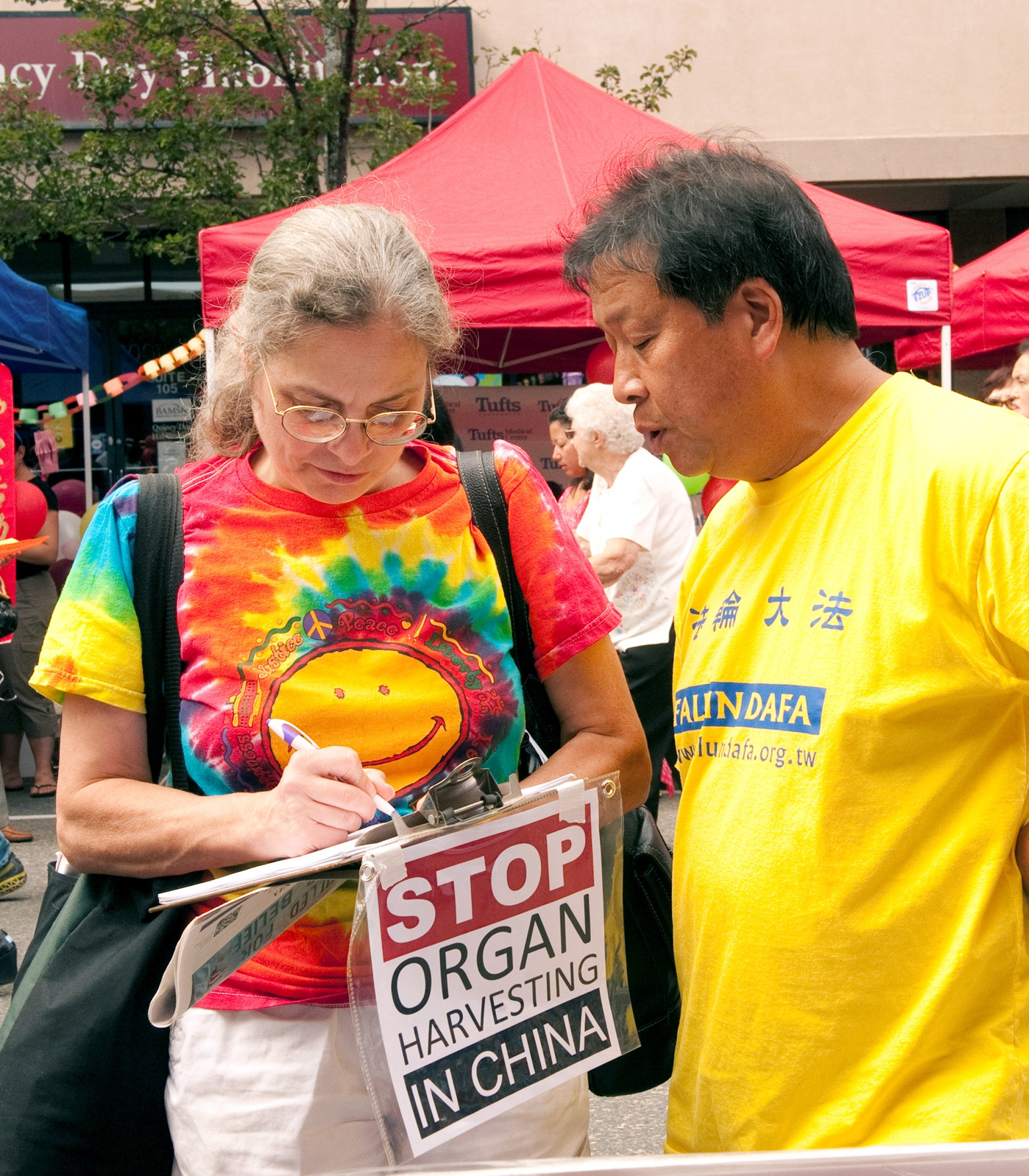 一对年轻的夫妇告诉学员:“我们曾经在中国住过,知道活摘器官是怎么回事。”他们立即就在请愿书上签名。