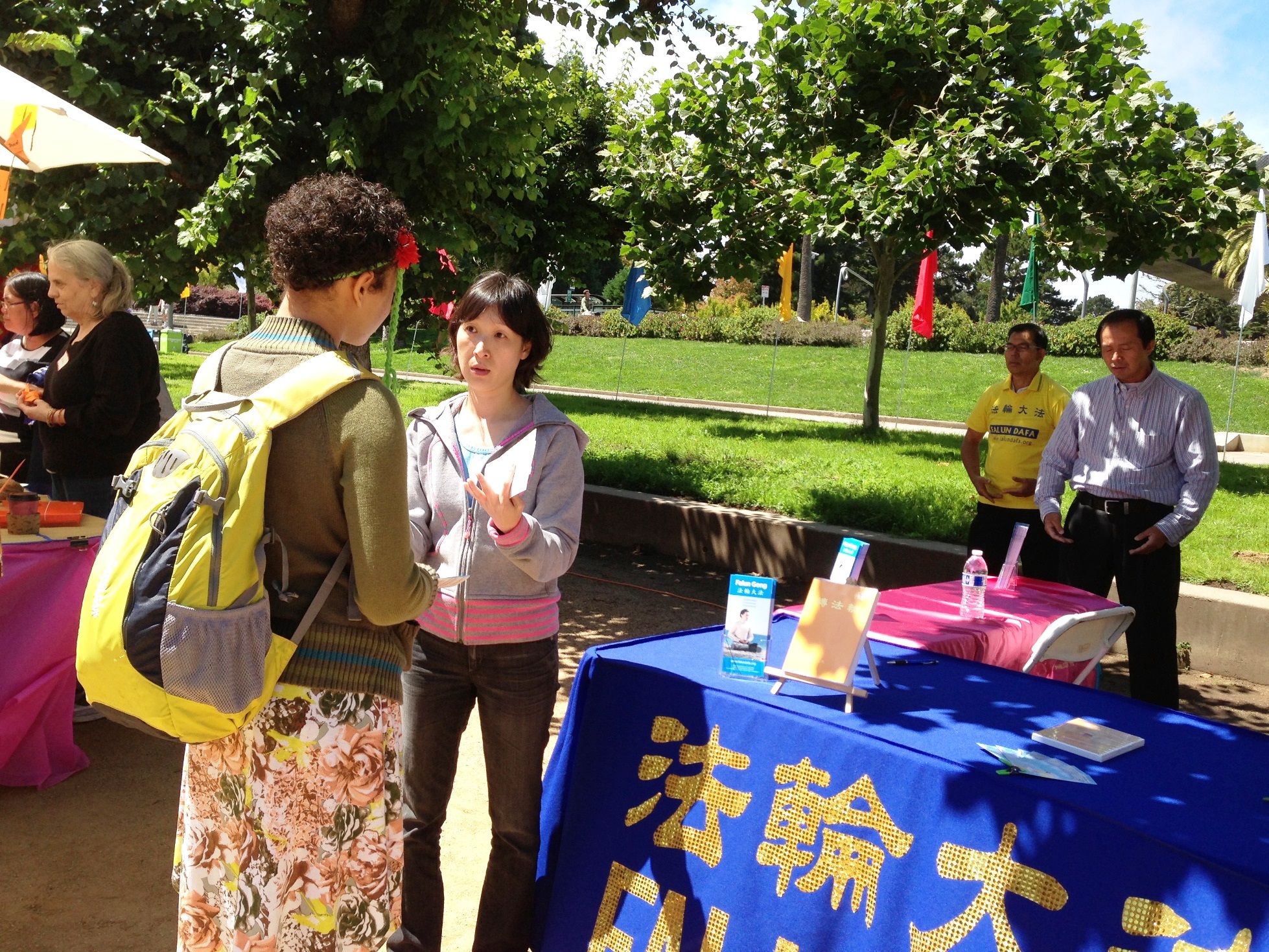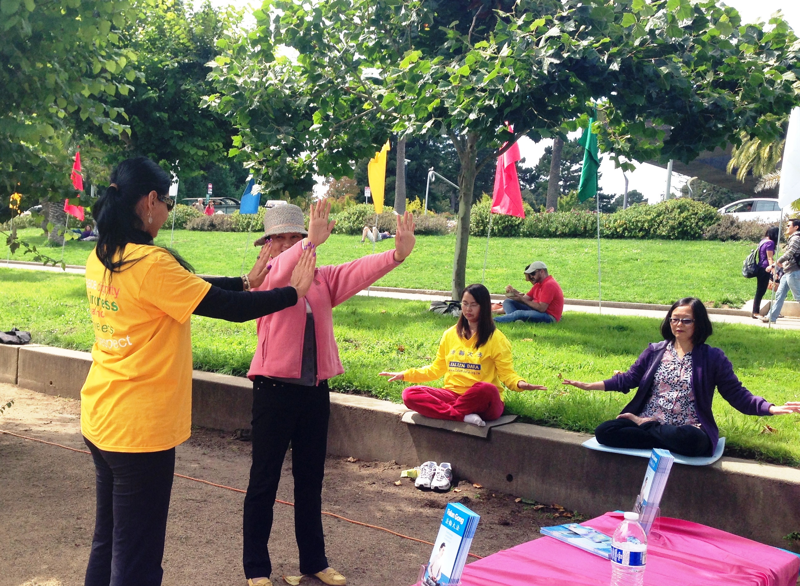 被祥和的炼功音乐和舒缓的功法所吸引,德丽丝站在法轮功的真相台前,静静的观看着功法演示。当仔细听了关于法轮功的介绍后,她马上学习了法轮功的第一至第四套功法,并购买了《转法轮》,还询问了炼功点的讯息才离去。