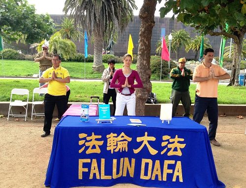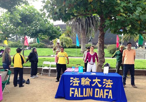 当天活动从早上十一点开始,到傍晚六点介绍。法轮功学员在展示区内演示法轮功的五套功法,祥和的炼功音乐和舒缓的功法,吸引了众多游人驻足观看和了解什么是法轮功,不少人还当场学炼功法。