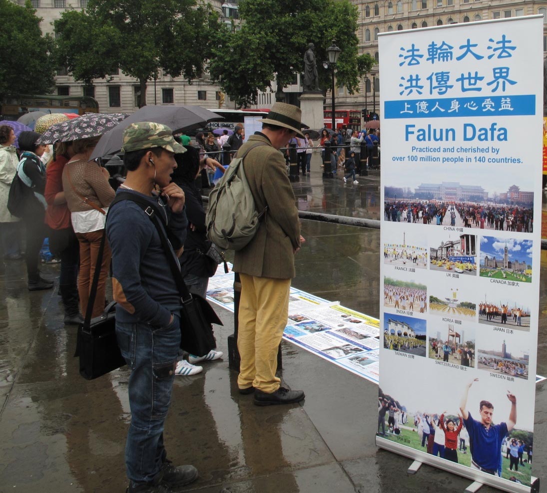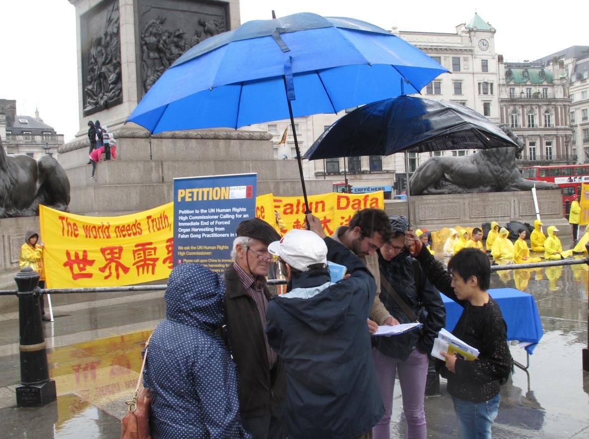 法轮功真相的呈现,特别是中共活摘法轮功学员器官罪恶的曝光,让鸽子广场上、来自世界各地的游客们深受震撼。尽管当天活动碰上了伦敦的下雨天气,有时雨下的很大,但参加活动的法轮功学员不为所动,把鸽子广场变成以风雨做幕、传播法轮功真相、揭露中共邪党罪行的舞台。面对法轮功真相,人们在思考、在选择,了解真相的人们纷纷在“医生反对中共强摘器官协会”(DAFOH)发起的制止中共强摘器官、呼吁停止迫害法轮功的征签表上签名,支持法轮功反迫害。