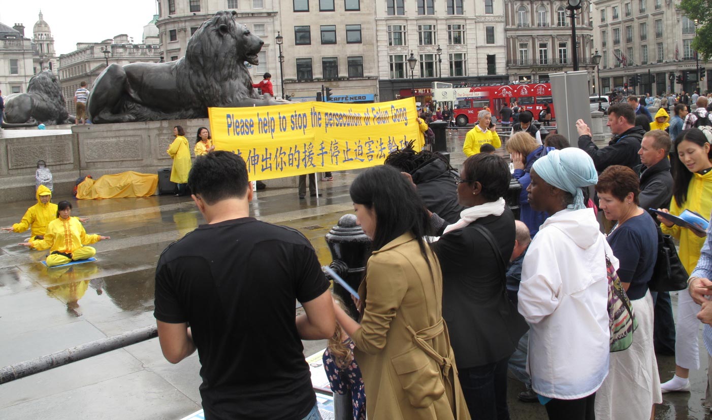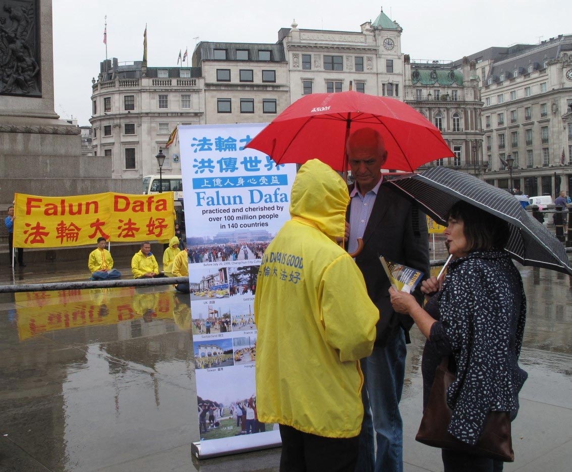 哈德森女士(Ms. Hudson)是位住在伦敦郊外的心理学家,当日下午她在路过鸽子广场时看到了正在雨中打坐的法轮功学员,她被法轮功学员们专注平和的神情所吸引,立即掏出自己的相机把法轮功学员雨中打坐入静的画面摄入镜头。和法轮功学员简短对话后,她立即在反对中共强摘器官征签表上签名。她表示自己非常清楚中共政权在侵犯人权上的劣迹,并指出从心理学的专业角度能够理解中共为什么害怕法轮功。她说:“平和的打坐非常有益,她能让你头脑清晰。但有人会因此害怕,怕因此失去对你的控制。”哈德森女士还由衷地表达对在雨中坚守不动平和打坐的法轮功学员的赞赏,她说:“哇,在这样的环境里能够这样专注,太了不起了,这样的打坐本身就太有吸引力了,何况你们是坐在这里,在鸽子广场。”